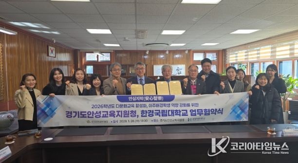 코리아타임뉴스 사회팀 | 경기도안성교육지원청은 2026년 1월 28일, 경기도안성교육지원청에서 한경국립대학교와 함께 안성 관내 다문화교육 활성화 및 이주배경학생 역량 강화를 위한 업무협약(MOU)을 체결했다.