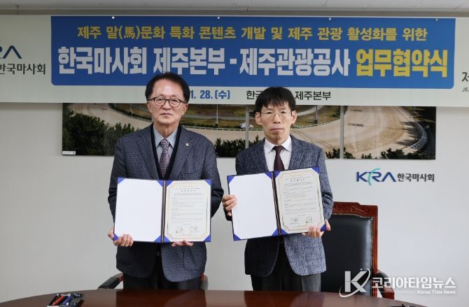 코리아타임뉴스 박찬식 기자 | 제주관광공사(사장 고승철)는 지난 28일 렛츠런파크 제주에서 한국마사회 제주본부(본부장 유병돈)와 제주 말(馬) 문화 특화 콘텐츠 개발 및 제주관광 활성화를 위한 업무협약(MOU)을 체결했다고 29일 밝혔다.