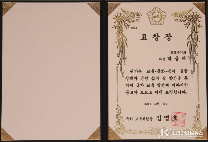 코리아타임뉴스 이아름 기자 | 진도군의회 박금례의장, 2025년 12월 23일 한국프레스센터에서 한국시사경제 • 코리아타임뉴스(윤광희 회장)주최, SBS • 기획재정부 • 교육부 • 문화체육관광부 • 농림축산식품부 • 산업통상부 • 기후에너지환경부 • 고용노동부 • 해양수산부 • 중소벤처기업부 후원으로 열린 ‘2025 대한민국 글로벌파워브랜드 대상(GPBA) 및 국회 상임위원장 표창 시상식’ 에서 박금례의장이 대상과 국회 교육위원장 표창을 수상했다.