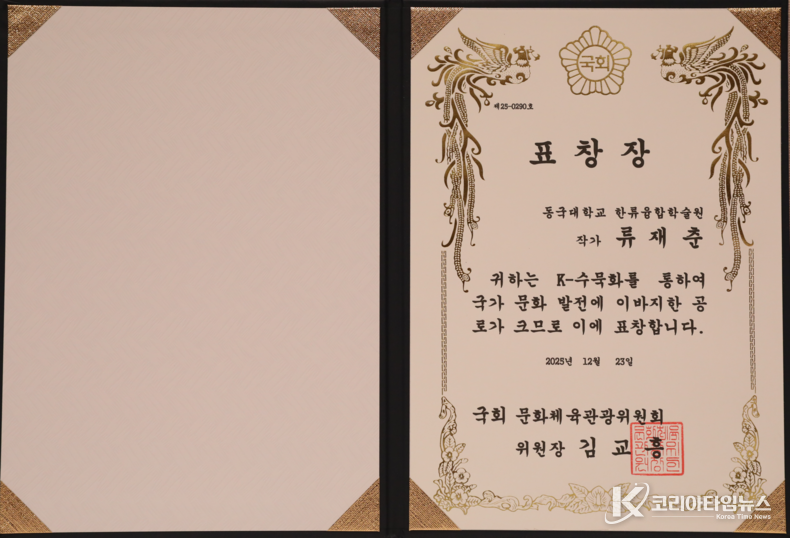 코리아타임뉴스 이아름 기자 | 동국대학교 류재춘 교수, 2025년 12월 23일 한국프레스센터에서 한국시사경제 • 코리아타임뉴스(윤광희 회장)주최, SBS • 기획재정부 • 교육부 • 문화체육관광부 • 농림축산식품부 • 산업통상부 • 기후에너지환경부 • 고용노동부 • 해양수산부 • 중소벤처기업부 후원으로 열린 ‘2025 대한민국 글로벌파워브랜드 대상(GPBA) 및 국회 상임위원장 표창 시상식’ 에서 류재춘 교수가 대상과 국회 문화체육관광위원장 표창을 수상했다.