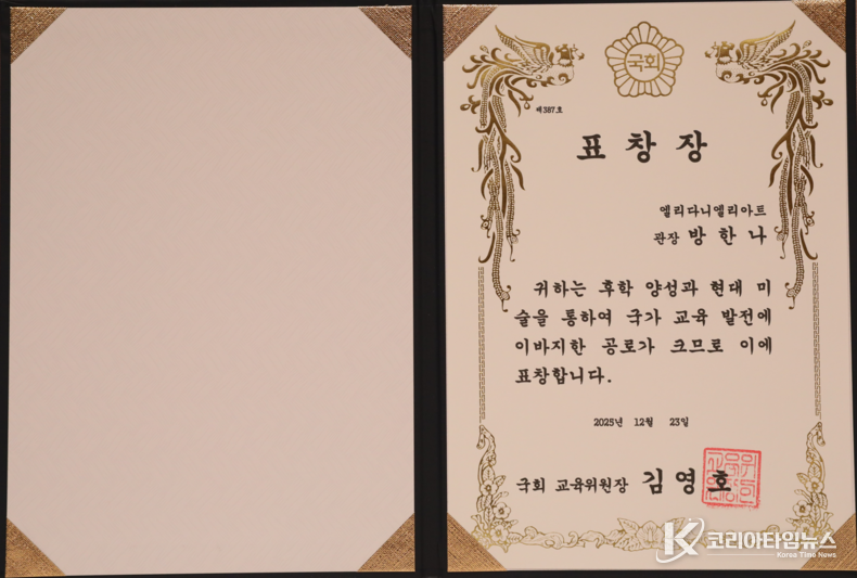 코리아타임뉴스 이아름 기자 | 엘리다니엘리아트 방한나 화백이 2025년 12월 23일 한국프레스센터에서 한국시사경제 • 코리아타임뉴스(윤광희 회장)주최, SBS • 기획재정부 • 교육부 • 문화체육관광부 • 농림축산식품부 • 산업통상부 • 기후에너지환경부 • 고용노동부 • 해양수산부 • 중소벤처기업부 후원으로 열린 ‘2025 대한민국 글로벌파워브랜드 대상(GPBA) 및 국회 상임위원장 표창 시상식’ 에서 방한나 작가가 대상과 국회 교육위원장 표창을 수상했다.