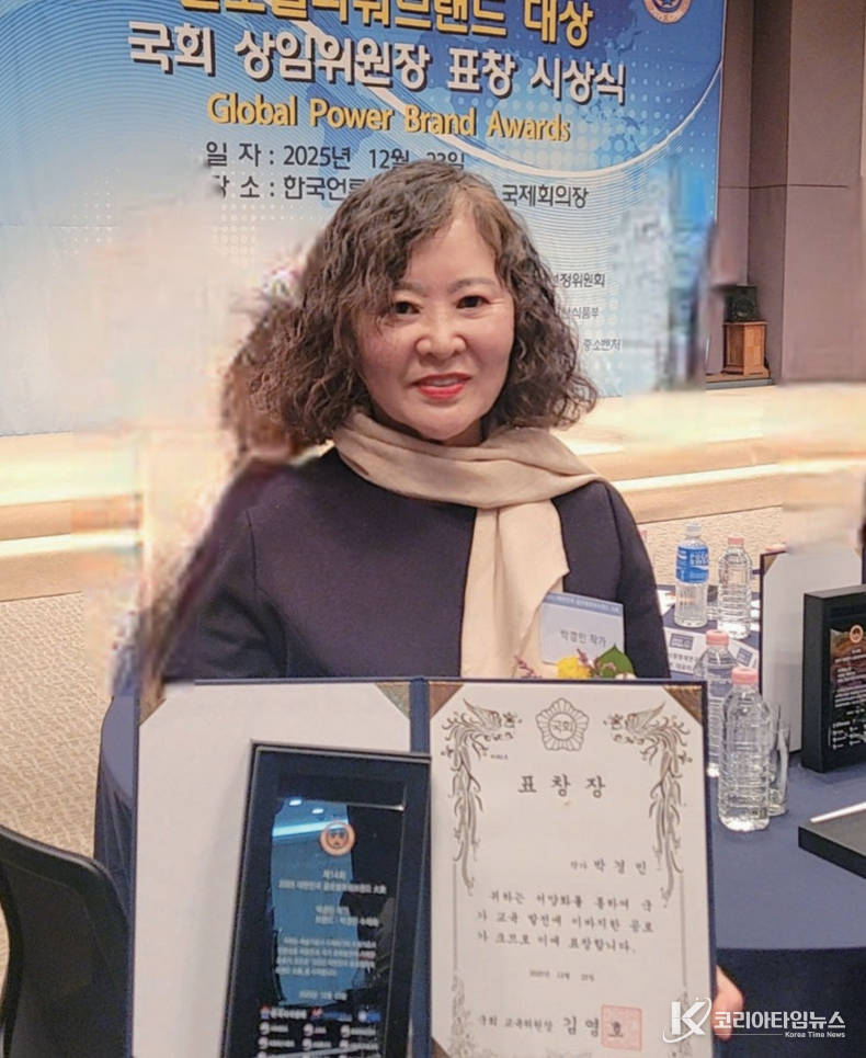 코리아타임뉴스 박찬식 기자 | 박경민 작가가 2025년 12월 23일 한국프레스센터에서 한국시사경제 • 코리아타임뉴스(윤광희 회장)주최, SBS • 기획재정부 • 교육부 • 문화체육관광부 • 농림축산식품부 • 산업통상부 • 기후에너지환경부 • 고용노동부 • 해양수산부 • 중소벤처기업부 후원으로 열린 ‘2025 대한민국 글로벌파워브랜드 대상(GPBA) 및 국회 상임위원장 표창 시상식’ 에서 박경민 작가가 대상과 국회 교육위원장 표창을 수상했다.