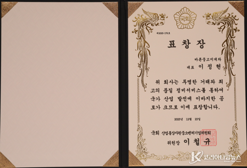 코리아타임뉴스 이아름 기자 | 바른중고지게차 이정현 대표, 2025년 12월 23일 한국프레스센터에서 한국시사경제 • 코리아타임뉴스(윤광희 회장)주최, SBS • 기획재정부 • 교육부 • 문화체육관광부 • 농림축산식품부 • 산업통상부 • 기후에너지환경부 • 고용노동부 • 해양수산부 • 중소벤처기업부 후원으로 열린 ‘2025 대한민국 글로벌파워브랜드 대상(GPBA) 및 국회 상임위원장 표창 시상식’ 에서 이정현 대표가 대상과 국회 산업통상자원중소벤처기업위원장 표창을 수상했다.