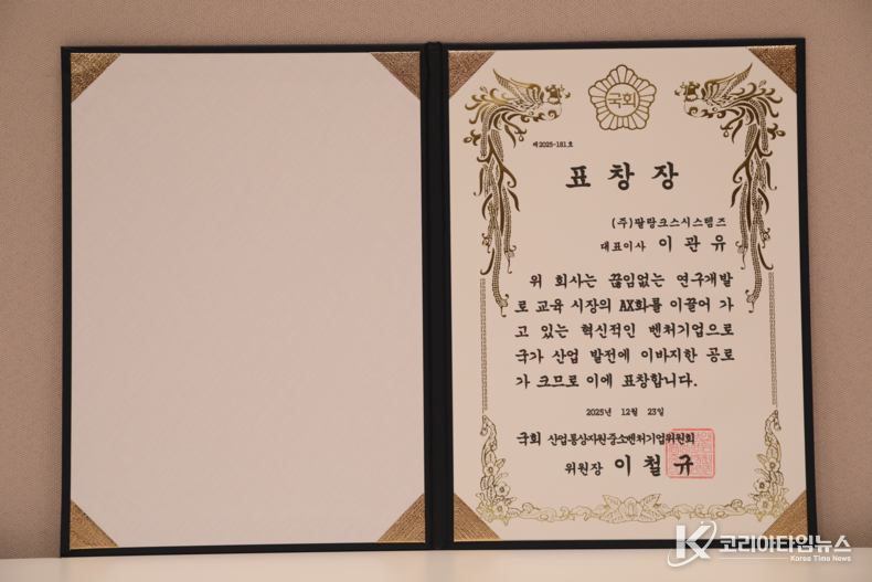 코리아타임뉴스 김태훈 기자 | 팔랑크시스템즈 학원의 신 이관유 대표가 2025년 12월 23일 한국프레스센터에서 한국시사경제 • 코리아타임뉴스(윤광희 회장)주최, SBS • 기획재정부 • 교육부 • 문화체육관광부 • 농림축산식품부 • 산업통상부 • 기후에너지환경부 • 고용노동부 • 해양수산부 • 중소벤처기업부 후원으로 열린 ‘2025 대한민국 글로벌파워브랜드 대상(GPBA) 및 국회 상임위원장 표창 시상식’ 에서 이관유 대표가 대상과 국회 산업통상자원중소벤처기업위원장 표창을 수상했다.