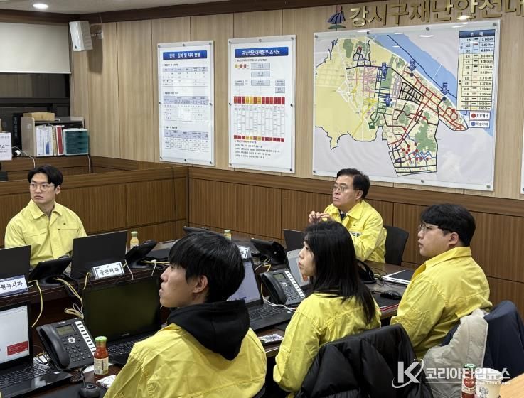 코리아타임뉴스 윤광희 기자 | 진교훈 서울 강서구청장이 1일 밤부터 2일 새벽 사이에 서울 전역에 많은 눈이 내릴 것이 예보됨에 따라 구 제설대책본부를 찾아 제설대응 체계를 점검했다.