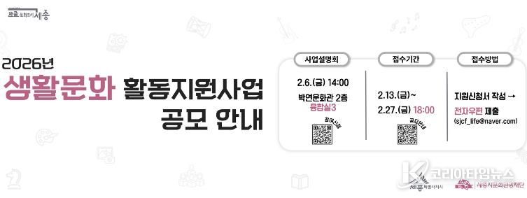 코리아타임뉴스 세종취재분부 | 세종시문화관광재단은 일상 속 시민 주도 생활문화 확산과 지역공동체 의식 강화를 위해 2026년 생활문화 활동지원사업 공모를 진행한다.