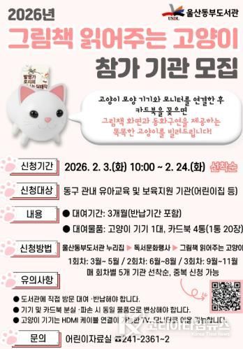 코리아타임뉴스 사회팀 | 울산동부도서관은 2월 3일부터 24일까지 동구 어린이집과 유치원, 보육 기관 등을 대상으로 ‘그림책 읽어주는 고양이’ 프로그램 참가 기관을 모집한다.