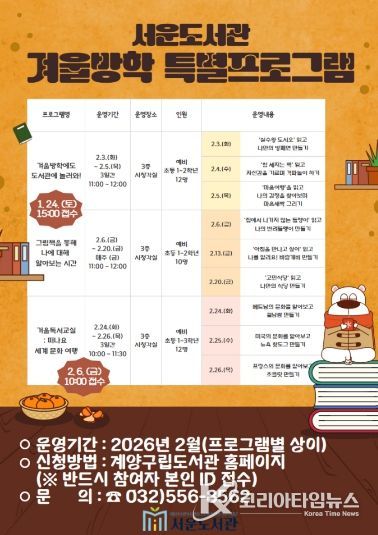 코리아타임뉴스 사회팀 | 인천 계양구 서운도서관(관장 권문혁)은 2026년 겨울방학을 맞아 어린이를 위한 다양한 특강 프로그램을 운영한다.