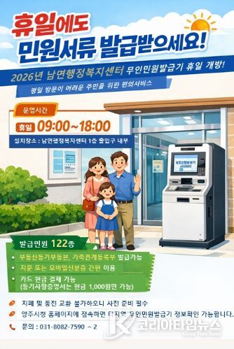 코리아타임뉴스 윤광희 기자 | 양주시 남면 행정복지센터는 행정복지센터 내에 설치된 무인민원발급기 운영일을 기존 평일에서 휴일까지 확대해 지난 17일부터 운영을 시작했다고 밝혔다.