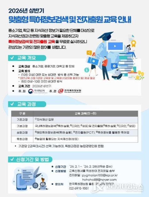 코리아타임뉴스 오영주 기자 | 지식재산처는 예비 출원인들의 지식재산 출원 역량 강화를 위해 2월 1일부터 ❶맞춤형 특허정보검색 및 전자출원 교육과 ❷지식재산권 초청 교육에 참여할 신청자를 모집한다고 밝혔다.