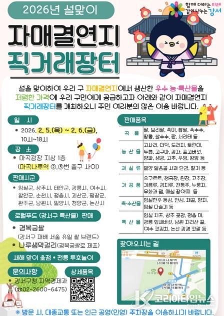 코리아타임뉴스 윤광희 기자 | 서울 강서구가 오는 5일부터 6일까지 이틀간 ‘설맞이 직거래장터’를 운영한다고 밝혔다.