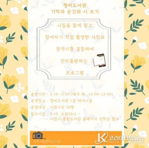 코리아타임뉴스 문화팀 | 이천시 청미도서관은 시민들이 직접 찍은 사진으로 시를 쓰고 전자책을 출판하는 ‘기억과 순간과 시 쓰기’ 프로그램을 운영한다.