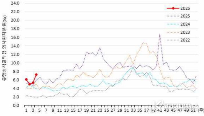 질병관리청 표본감시 자료에 따르면, 1월 넷째 주 유행성결막염 의사환자 분율은 인구 1,000명당 7.2명으로 집계됐다. 이는 전주(5.3명)보다 증가한 수치로, 2022년부터 2025년까지 최근 4년간 같은 기간과 비교해도 가장 높은 수준이다.