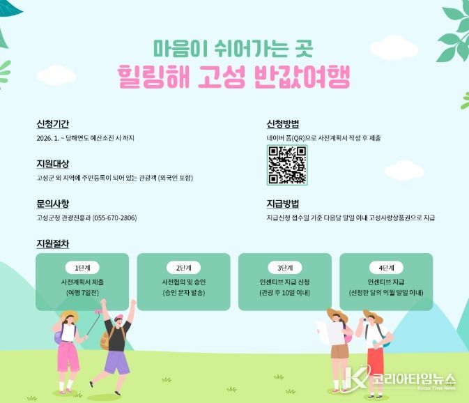 코리아타임뉴스 경남취재본부 | 고성군은 관광객 유치증대 및 체류형 관광 활성화로 지역경제에 활력을 불어넣기 위해 2026년 신규사업으로 ‘마음이 쉬어가는 곳, 힐링해 고성 반값여행’을 시행한다고 밝혔다.