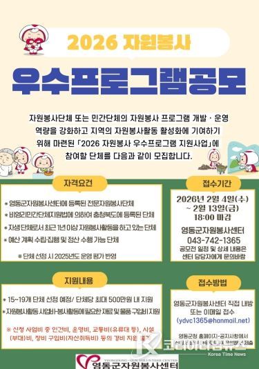 코리아타임뉴스 박찬식 기자 | 충북 영동군은 자원봉사단체와 민간단체의 자원봉사 프로그램 개발·운영 역량을 강화하고 지역 자원봉사 활성화를 도모하기 위해 ‘2026년 자원봉사 우수프로그램 지원사업’에 참여할 단체를 모집한다.