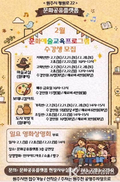 코리아타임뉴스 노승선 기자 | 원주시 문화공유플랫폼이 2월 문화예술 교육프로그램 수강생을 모집한다.