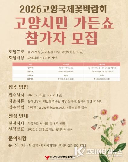 코리아타임뉴스 문화팀 | (재)고양국제박람회재단이 오는 4월 24일 일산호수공원에서 개최되는 2026고양국제꽃박람회의 시민 참여 프로그램 ‘고양시민 가든쇼’의 참가자를 이달 20일까지 모집한다.