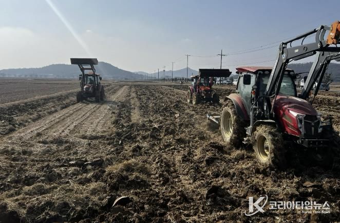 코리아타임뉴스 노승선 기자 | 영암군이 5일 학산면 천해마을에서 ‘왕우렁이 피해 예방 논 깊이갈이 시연회’를 개최했다.