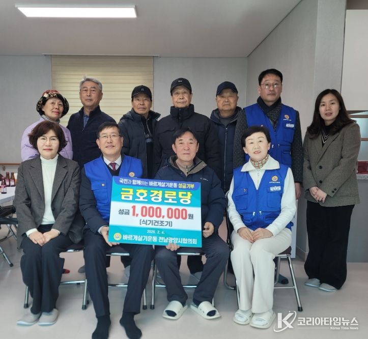 코리아타임뉴스 전남취재본부 | 바르게살기운동 광양시협의회(회장 이승안)가 지난 4일 새로 개소한 금호경로당(회장 김원태)을 방문해 어르신들을 위한 성금 100만 원을 전달하며 이웃사랑을 실천했다.