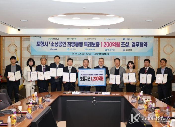 코리아타임뉴스 박찬식 기자 | 포항시는 자금 조달에 어려움을 겪는 소상공인을 지원하기 위해 6일 경북신용보증재단 및 협약 금융기관과 총 1,200억 원 규모의 ‘희망동행 특례보증재원’ 조성을 위한 업무협약(MOU)을 체결했다.