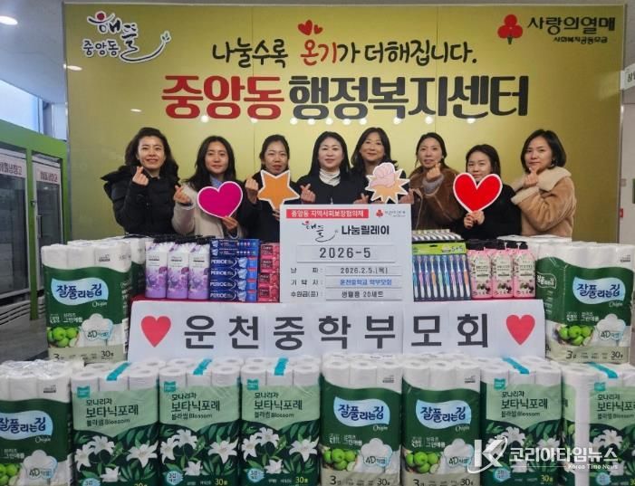 백경희 중앙동장은 “지역사회를 위해 이웃사랑을 실천해 주신 운천중학교 학부모회에 깊이 감사드린다”며 “기탁해 주신 물품은 정성 어린 마음을 담아 도움이 필요한 어르신들께 소중히 전달하겠다”고 밝혔다.