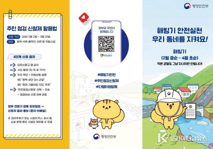 코리아타임뉴스 기동취재팀 | 이천시가 기온 상승으로 사고발생 위험이 높아지는 해빙기를 맞아, 시민들이 직접 생활 속 위험 요인을 찾아 점검을 요청하는 ‘해빙기 안전점검 주민점검신청제’를 시행한다고 밝혔다.
