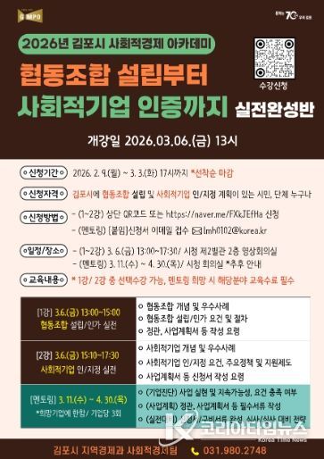 코리아타임뉴스 기동취재팀 | 김포시가 사회문제 해결을 위한 참신한 아이디어와 실행력을 갖춘 사회적경제기업 육성을 위해 ‘2026년 김포시 사회적경제 아카데미’를 개설하고, 오는 3월 3일까지 수강생을 모집한다.