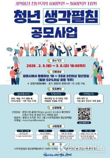 시는 청년의 창의적인 아이디어를 실제 활동으로 펼칠 수 있도록 돕는 ‘2026년 청년 생각펼침 공모사업’ 참여팀을 오는 3월 6일까지 모집한다.