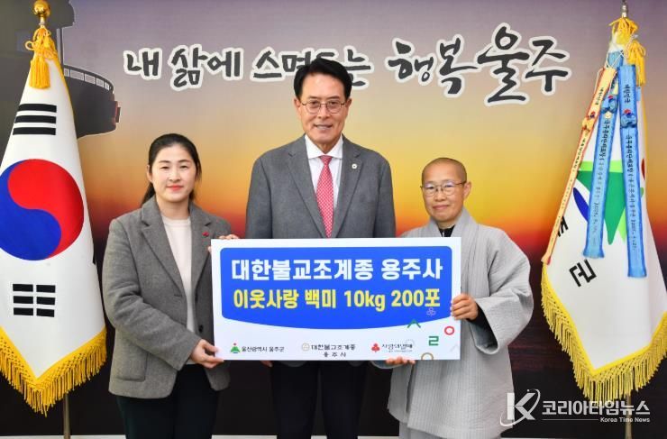 코리아타임뉴스 울산취재본부 | 대한불교조계종 용주사가 9일 울주군 저소득세대를 돕기 위해 총 600만원 상당의 백미(10㎏) 200포를 전달했다.