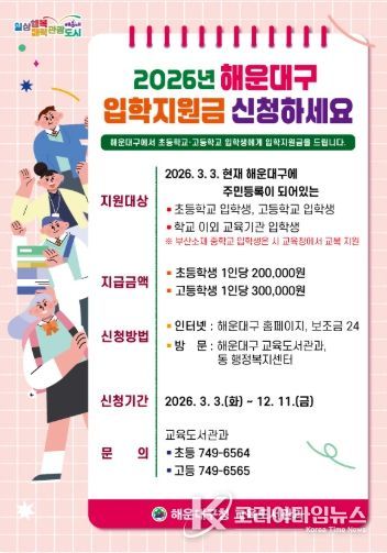 코리아타임뉴스 이아름 기자 | 해운대구는 가정의 교육비 부담을 완화하고 교육의 공공성과 형평성을 높이기 위해 2026학년도 입학생을 대상으로 ‘입학지원금’을 지급한다고 밝혔다.