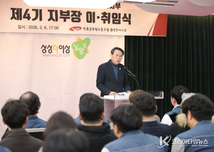 코리아타임뉴스 경기취재본부 | 남양주시는 6일 시청 여유당에서 전국공무원노동조합 남양주시지부가 제4기 지부장 이·취임식을 열었다고 9일 밝혔다.
