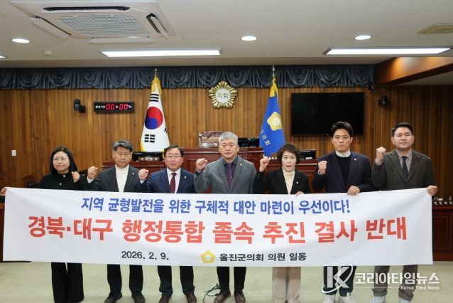 코리아타임뉴스 노승선 기자 | 울진군의회는 2월 9일 본회의장에서 경북·대구 행정통합 졸속 추진에 대한 강력한 반대 입장을 담은 성명서를 발표했다.