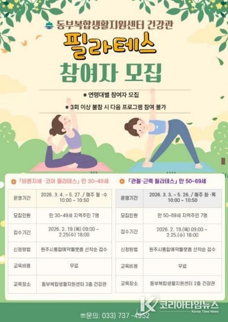 코리아타임뉴스 이아름 기자 | 원주시 동부복합생활지원센터 건강관은 오는 19일부터 중·장년을 대상으로 한 필라테스 프로그램 참여자를 모집한다.
