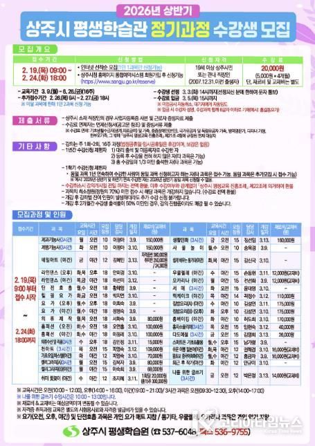 코리아타임뉴스 노승선 기자 | 상주시 평생학습원은 시민들의 자기 계발과 평생교육 기회 확대를 위하여 2026년 상반기 평생학습관 정기과정 수강생을 모집한다.