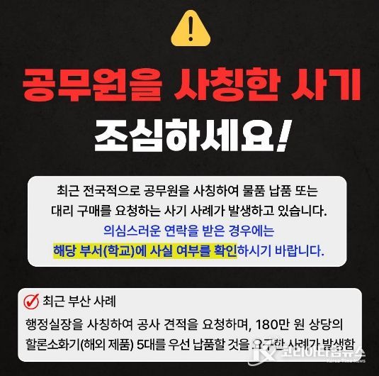 교육청 관계자는 “학교나 교육청은 어떠한 경우에도 업체에 물품 대리 구매를 요구하거나 개인 계좌로 대금 송금을 유도하지 않는다”며, “학교 관계자라며 연락이 오더라도 반드시 기관 공식 전화번호로 사실 여부를 재확인달라”고 당부했다.