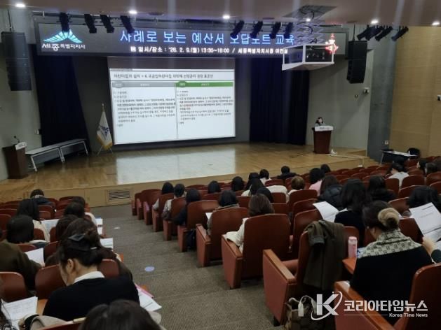 코리아타임뉴스 세종취재분부 | 세종특별자치시육아종합지원센터는 2월 9일 세종시청 여민실에서 관내 어린이집 원장을 대상으로 어린이집의 투명하고 효율적인 회계 운영을 지원하기 위해‘사례로 보는 오답노트: 2026년 예산 실무교육’의 현장 중심 실무 교육을 실시했다고 밝혔다.