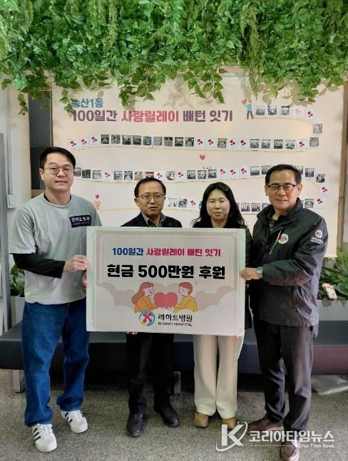 코리아타임뉴스 기동취재팀 | 의정부시 송산1동주민센터는 2월 9일 용현동 소재 리하트병원이 ‘100일간 사랑릴레이 배턴 잇기’에 동참해 성금 500만 원을 기탁했다고 밝혔다.