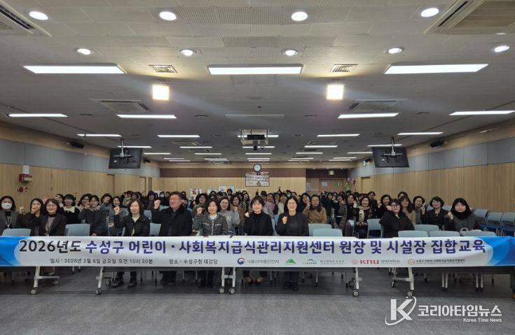 코리아타임뉴스 노승선 기자 | 대구 수성구 어린이·사회복지급식관리지원센터는 지난 6일 수성구청 대강당에서 센터에 등록된 어린이 급식소 원장(시설장)을 대상으로 집합교육을 실시했다.