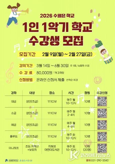 코리아타임뉴스 사회팀 | 수원문화재단이 오는 27일까지 시민 누구나 참여할 수 있는 ‘2026 수원은학교 1인 1악기 학교’ 수강생을 선착순으로 모집한다.