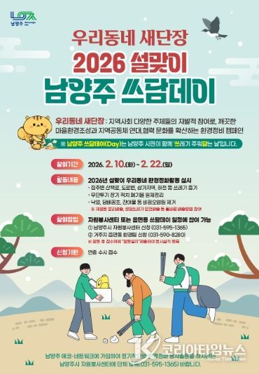 코리아타임뉴스 경기취재본부 | 남양주시는 10일부터 22일까지 시 전역에서 ‘설맞이 우리동네 새단장 남양주 쓰담데이 집중 추진기간’을 운영한다고 밝혔다.