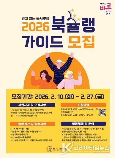 코리아타임뉴스 대전취재본부 | 대전 동구는 책을 사랑하고 글쓰기에 관심 있는 구민을 대상으로, 2026년 동구 도서추천단 ‘북슐랭 가이드’를 모집한다고 10일 밝혔다.
