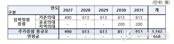 이와 함께 2027년의 경우 기존의대는 증원규모의 80% 규모(490명)를 증원하도록 해서 증원 초기 의대교육 현장의 부담을 완화할 수 있도록 했다.