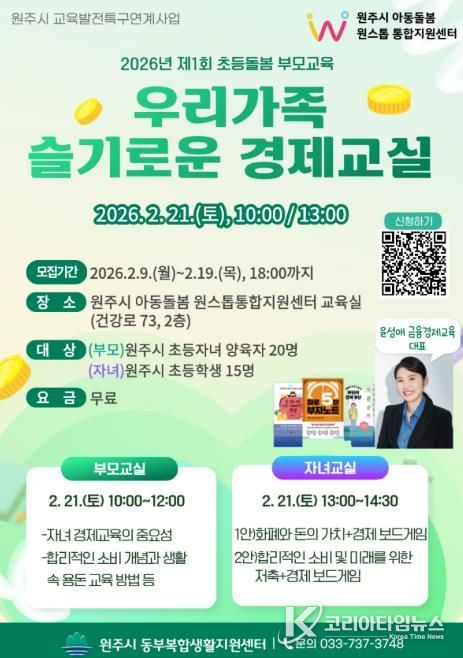 코리아타임뉴스 이아름 기자 | 원주시 아동돌봄 원스톱통합지원센터는 2월 21일 초등생 가족을 위한 무료 경제 교육인'우리 가족 슬기로운 경제 교실'을 운영한다.