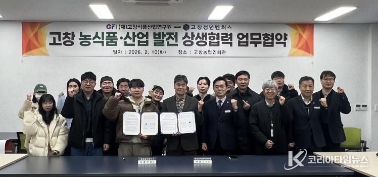 코리아타임뉴스 전북취재본부 | (재)고창식품산업연구원과 고창청년벤처스가 지난 10일 저녁 고창군농업인회관에서 고창군의 지속 가능한 발전과 청년 창업 생태계 활성화를 위한 업무협약(MOU)을 체결했다고 밝혔다.