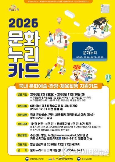 한편, 문화누리카드 지원 대상은 6세 이상 기초생활수급자와 차상위계층으로, 올해는 지난해보다 1만 원 인상된 15만 원으로 지원금이 확대됐다. 또한, 청소년기(13~18세)와 준고령기(60~64세) 대상자에게는 1만 원이 추가 지급된다.