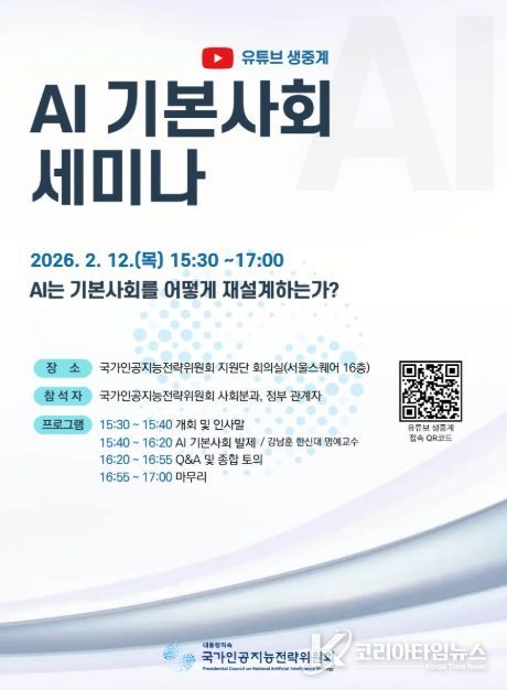 코리아타임뉴스 오영주 기자 | 국가인공지능전략위원회는 2월 12일 오후 3시 30분부터 AI 기본사회 세미나를 개최한다. 이번 세미나는 AI 기술 확산이 노동ㆍ복지ㆍ분배ㆍ사회안전망 등 경제ㆍ사회 정책 전반에 미치는 영향을 종합적으로 살펴보고, AI 시대에 부합하는 기본사회 제도 설계 방향에 대한 시사점을 도출하기 위해 마련됐다. 특히 AI 기술의 확산에 따라 부와 생산수단이 특정 주체에 집중됨과 동시에 고용ㆍ소득 양극화를 포함한 구조적 변화가 예상되는 상황에서, 기본사회 정책이 어떤 역할과 방향성을 갖고 추진되어야 하는지에 대한 심도 있는 논의가 진행될 예정이다.