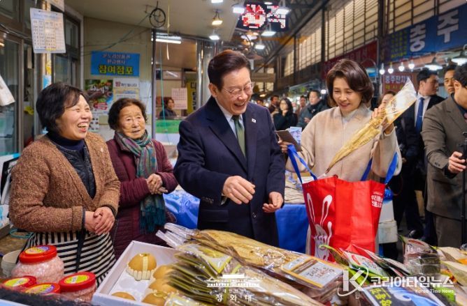 코리아타임뉴스 이아름 기자 | 이재명 대통령과 김혜경 여사는 오늘 낮, 설 명절을 앞두고 충북 충주시에 위치한 무학시장을 찾아 지역 세밑 물가를 점검하고 상인들을 만나 현장 의견을 청취했다.
