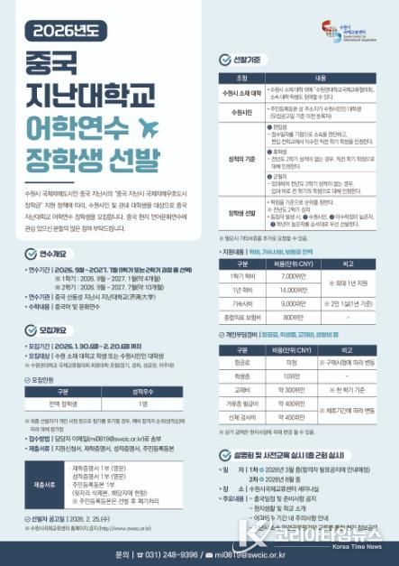 코리아타임뉴스 사회팀 | 수원특례시는 2월 20일까지 ‘2026년도 지난대학교 어학연수 장학생 프로그램’ 참가자 1명을 모집한다.