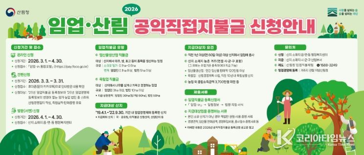 코리아타임뉴스 경북취재본부 | 울진군은 임업·산림의 공익적 기능을 증진하고 임업인의 소득 안정을 도모하기 위해 2026년 임업·산림 공익직접지불금신청을 오는 3월부터 접수한다.