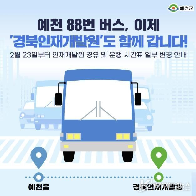 코리아타임뉴스 경북취재본부 | 예천군은 23일부터 88번 농어촌버스의 일부 운행 회차를 인재개발원까지 연장 경유해 운행한다.